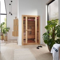 Il calore a infrarossi riscalda dall'interno senza grande sforzo fisico, il che significa che la sudorazione avviene un po' più tardi rispetto alla sauna tradizionale, ma è più intensa. Inoltre si suda più a lungo perché il calore viene trattenuto nel corpo più a lungo. Per le persone che trovano la sauna tradizionale troppo calda o che in precedenza hanno evitato l'esperienza della sauna a causa di problemi circolatori, questa cabina a infrarossi è un'ottima alternativa, poiché le temperature più piacevoli non gravano troppo sull'organismo. Anche la qualità convince: il legno di abete cicuta è uno dei legni più pregiati e densi al mondo. Per la sua composizione naturale ha un'ottima capacità di isolamento termico ed è quindi ideale per l'utilizzo nei sistemi sauna. Il calore viene trattenuto all'interno della sauna mentre la temperatura dello strato esterno della sauna rimane vicina alla temperatura ambiente. Grazie a questa caratteristica della pregiata materia prima non si verificano perdite di calore evidenti e quindi nessun consumo energetico inutile.