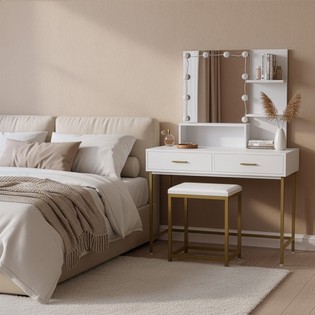 Med sin fantastiska färg och högkvalitativa material skapar detta sminkbord en charmig och elegant atmosfär. Bordet är tillverkat av lackerat MDF-trä, vilket ger en slät och attraktiv yta. Med sina två lådor erbjuder bordet gott om förvaringsutrymme för dina sminkredskap, accessoarer och personliga föremål. Sminkbordet har en rymlig spegel utrustad med dimbara LED-lampor. Du har möjlighet att ställa in ljuset på varmvitt, kallvitt eller neutralvitt beroende på dina önskemål och krav. Dessutom levereras sminkbordet med en pall som har en mjuk sittdyna. Pallen ger dig komfort och stödjer en ergonomisk sittställning under din skönhetsrutin.